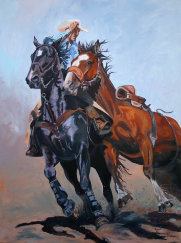 This is a pretty typical scene from any rodeo arena. The pick up man has a job that seems routine to most, but he is truly there for the safety of both animals and cowboys.
